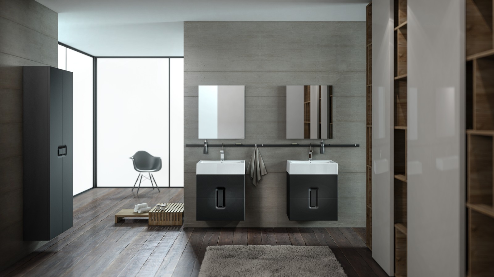 Rozmer skrinky pod umývadlo kopíruje rozmer umývadla. Všetky skrinky sú k dispozícii v dvoch povrchových úpravách - lesklá biela a matná čierna. Zrkadlová skrinka má zrkadlové plochy aj na vonkajších bočných stenách.